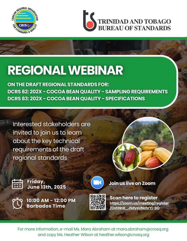 The CARICOM Regional Organisation for Standards and Quality (CROSQ) in collaboration with the Trinidad & Tobago Bureau of Standards – TTBS is hosting a Regional Webinar on the Draft Regional Standards for Cocoa, which are currently out for public enquiry.