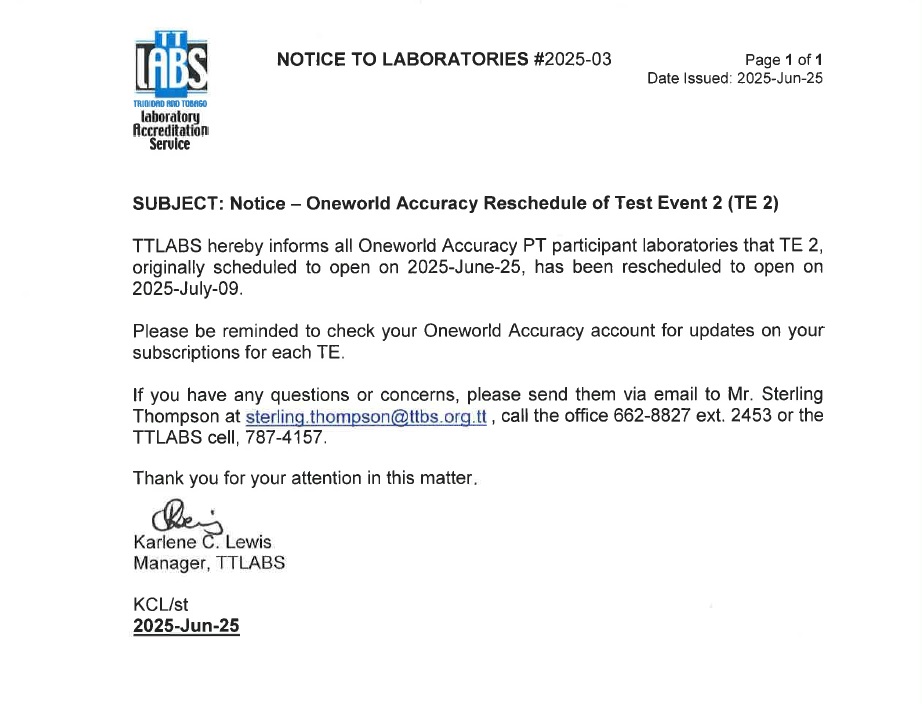 Notice – Oneworld Accuracy Reschedule of Test Event 2Posted by admin Date June 27, 2025 Category Lab Accreditation