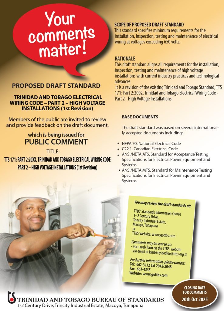 The Trinidad and Tobago Bureau of Standards has issued the following draft Voluntary National Standard for Public Comment: