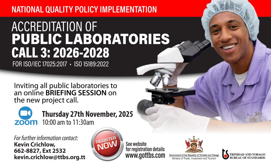 The Trinidad and Tobago Bureau of Standards (TTBS) in collaboration with the Ministry of Trade, Investment and Tourism are inviting public laboratories to participate in Call 3:2025-2027 of the Accreditation of Public Laboratories Project.