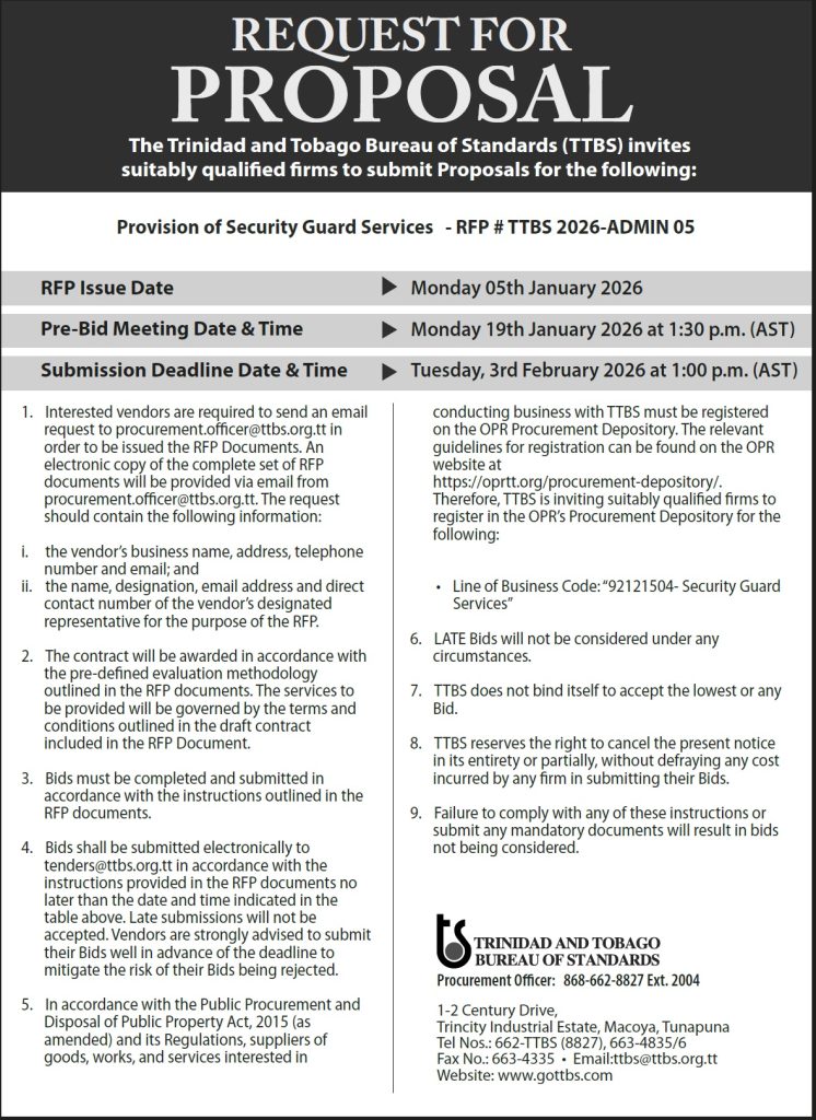 Request For Proposal: Provision of Security Guard ServicesPosted by admin Date January 5, 2026 Category Tenders