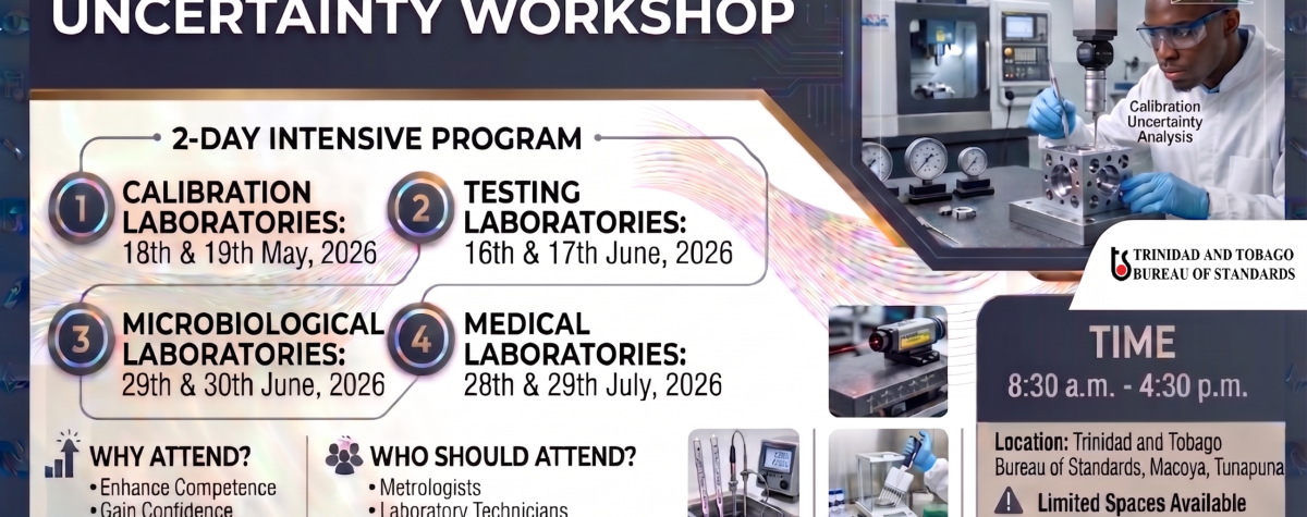Dear Valued Stakeholder, The Trinidad and Tobago Bureau of Standards (TTBS) is pleased to present MASTERING MEASUREMENT UNCERTAINTY, a series of Measurement Uncertainty Workshops. To Register please click on the following link: https://forms.gle/mAcQiuQTK5g66xQN6 We look forward to your participation