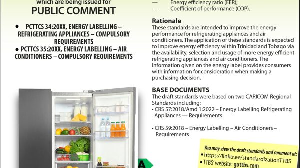 The Trinidad and Tobago Bureau of Standards has issued the following Draft Compulsory National Standards for Public Comment: PCTTCS 34:20XX – Energy labelling — Air conditioners — Compulsory requirements PCTTCS 35:20XX – Energy labelling — Refrigerating appliances — Compulsory requirements Members of the Public are invited to review and provide...